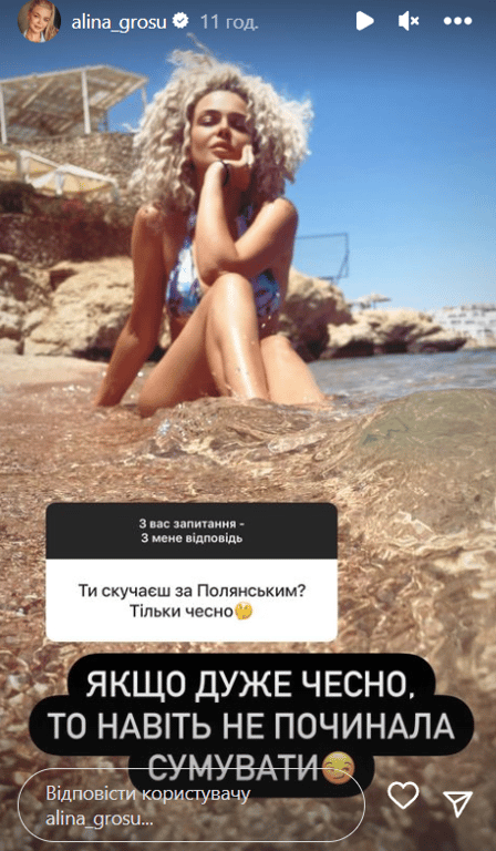 Деякі фанати Гросу зауважили, що вона не видаляє фотографії з Романом. На що Аліна написала: "Нічого не видаляла, і не буду! Це дитячий садок".