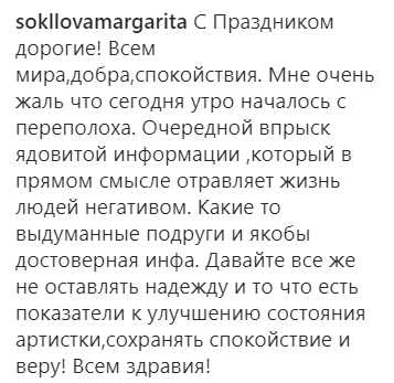 "Мені дуже шкода що сьогодні ранок почався з переполоху. Чергове впорскування отруйної інформації, яка в прямому сенсі отруює життя людей негативом. Якісь вигадані подруги і нібито достовірна інфа. Давайте все ж не залишати надію і те, що є показники до поліпшення стану артистки, зберігати спокій і віру!" — зазначила директор співачки.