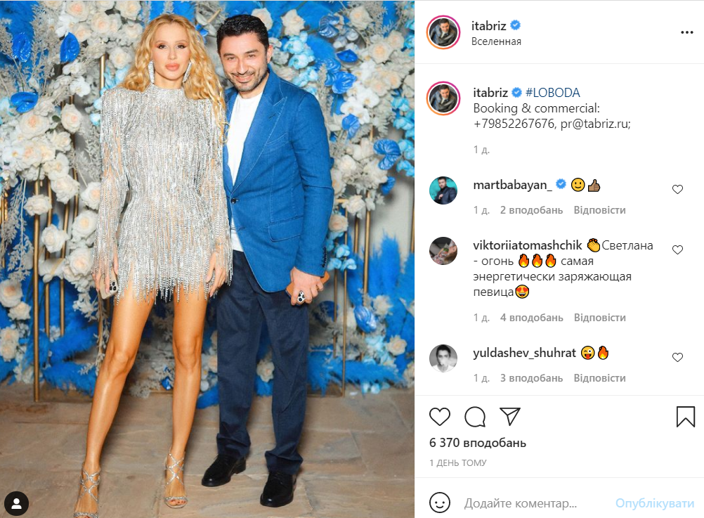У своєму Instagram-акаунті Табриз Шахіді опублікував спільне фото зі Світланою Лободою і підписав контакти, за якими можна зв'язатися для співпраці.
