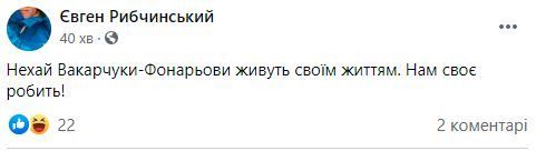 Втім, невдовзі композитор видалив свій допис зі сторінки. Натомість Євген залишив коротке повідомлення: "Нехай Вакарчуки-Фонарьови живуть своїм життям. Нам своє робить!".