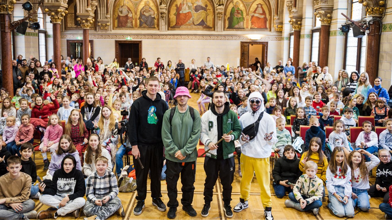 Kalush Orchestra устроил маленьким украинцам, которые были вынуждены с семьями покинуть Родину из-за полномасштабной войны, приятный сюрприз. Группа акапельно исполнила песню "Стефания" и пообщалась с маленькими украинцами.