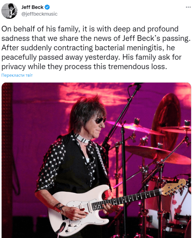 На 79-м году жизни скончался британский гитарист Джефф Бек, которого считают одним из самых влиятельных музыкантов в истории рок-музыки.