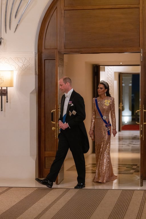 Кейт Миддлтон, которая в детстве недолго жила в Иордании, появилась на закате в платье нежно-розового цвета от бренда Elie Saab. Уже на торжественном ужине принцесса Уэльская была в тиаре и королевской атрибутике.